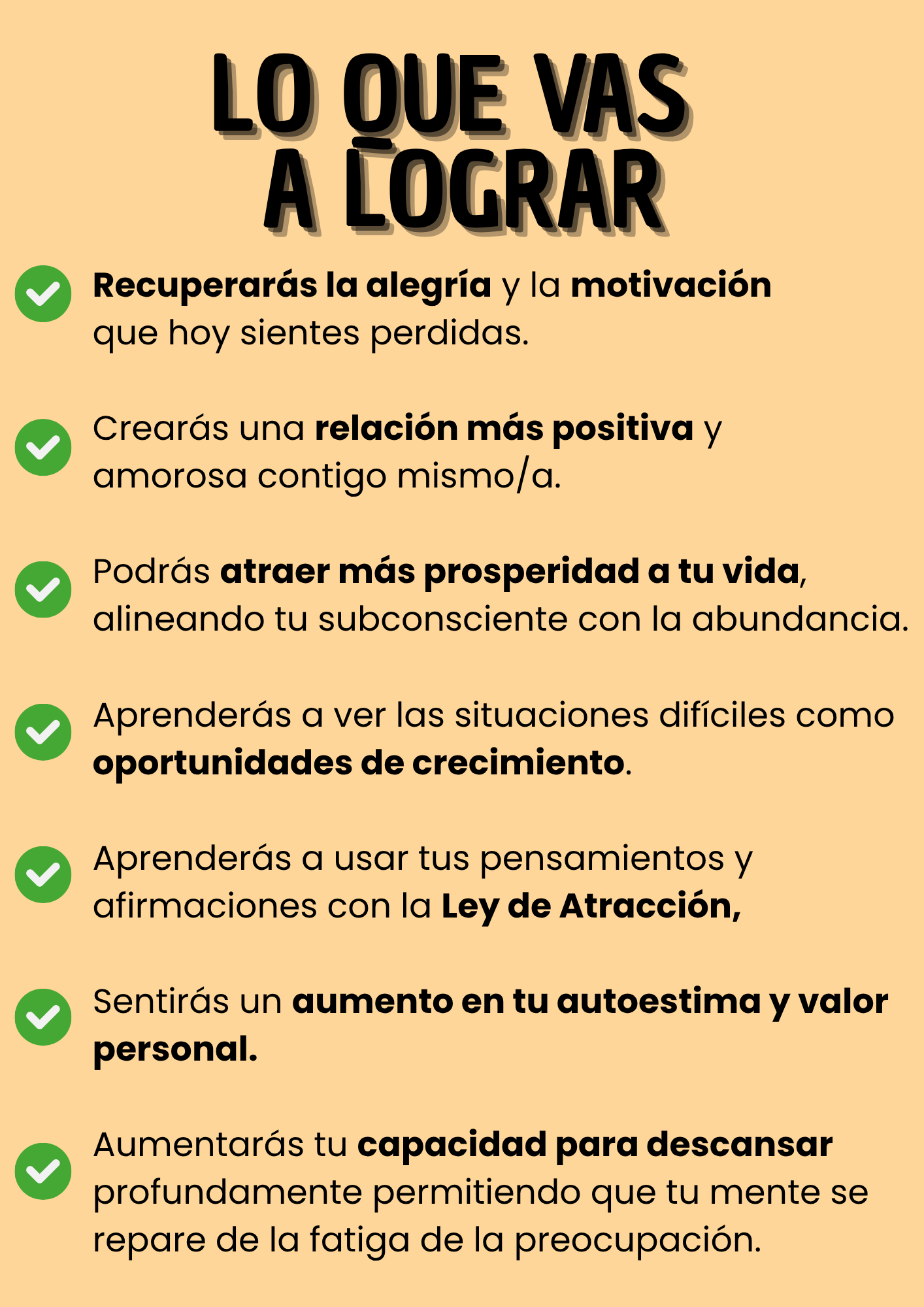 Sí, funciona porque no prometemos un cambio de vida externo en 7 días, sino un cambio de mente. En solo una semana, instalas los hábitos mentales (como el Protocolo de Certeza y la Gratitud Simple) que cortan de raíz la preocupación y la ansiedad. Este protocolo te da la base mental para que el cambio sea exponencial y sostenible después de los primeros 7 días.